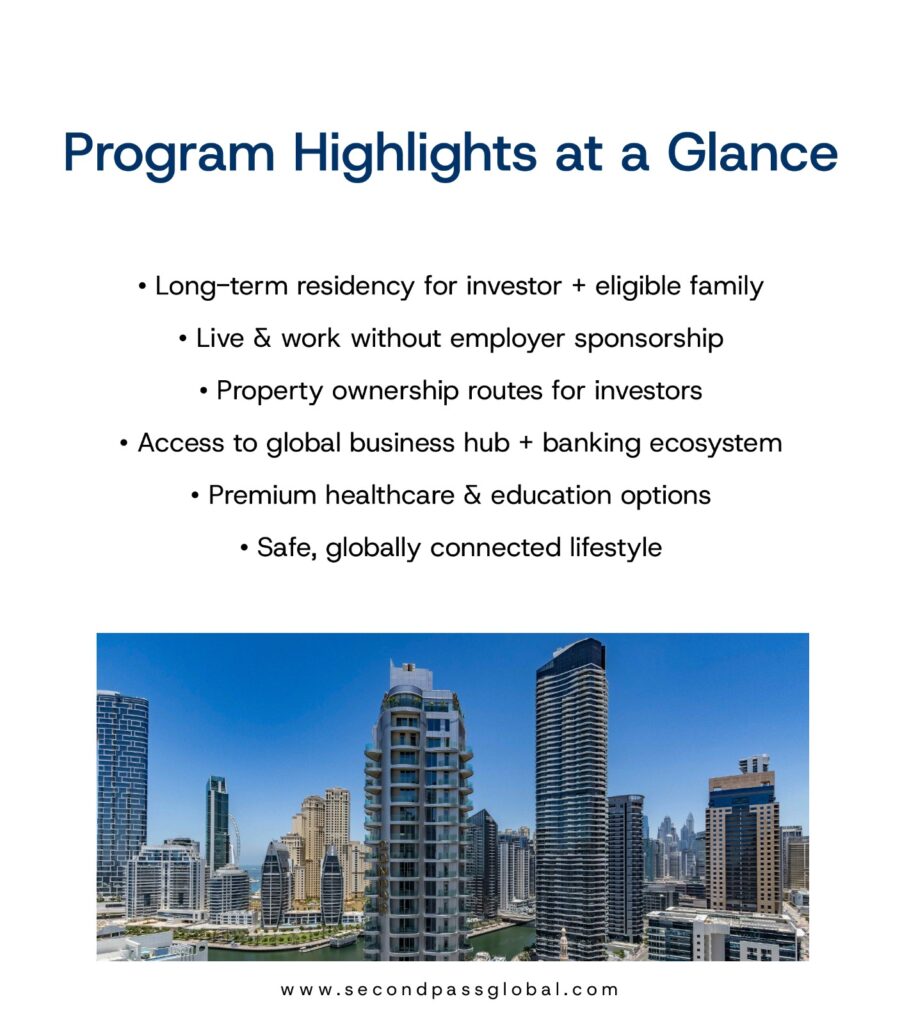 The UAE offers a secure and dynamic environment for investors seeking growth, mobility, and long-term residency in one of the world’s most competitive economies.