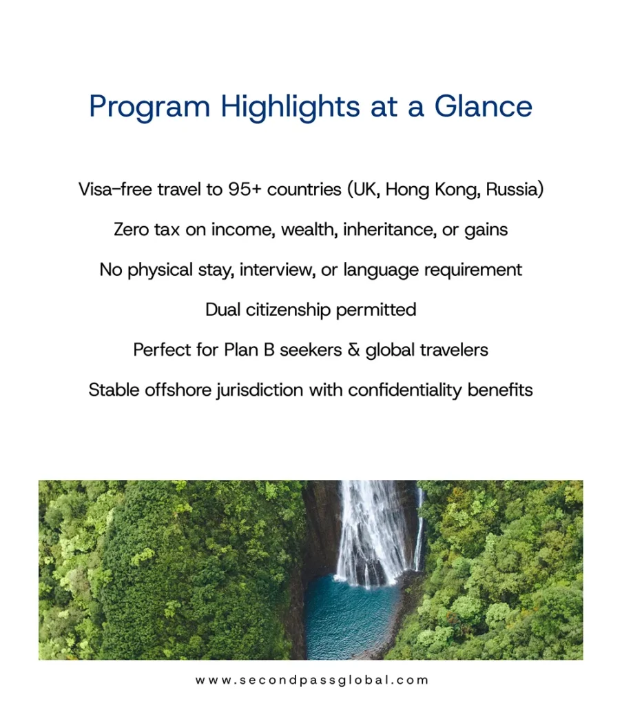 Vanuatu’s citizenship program is one of the fastest in the world. Get your passport in just 1–2 months with an investment starting at USD 130,000. Benefit from visa-free travel to 95+ countries, including the UK, Russia, and Hong Kong. No physical residency, language tests, or interviews required. Enjoy full confidentiality, dual citizenship rights, and zero taxes on income, inheritance, or capital gains. A smart move for global travelers and Plan B seekers looking for a secure, flexible future.