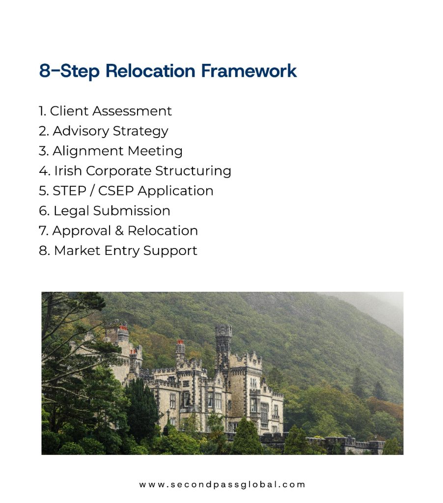Expand your business to Europe with Ireland’s Business Immigration Program 🇮🇪. Relocate your HQ and family in just 4–6 months using a clear 8-step framework, from strategy and corporate setup to legal submission and market entry support. Smooth, fast, and structured for success.