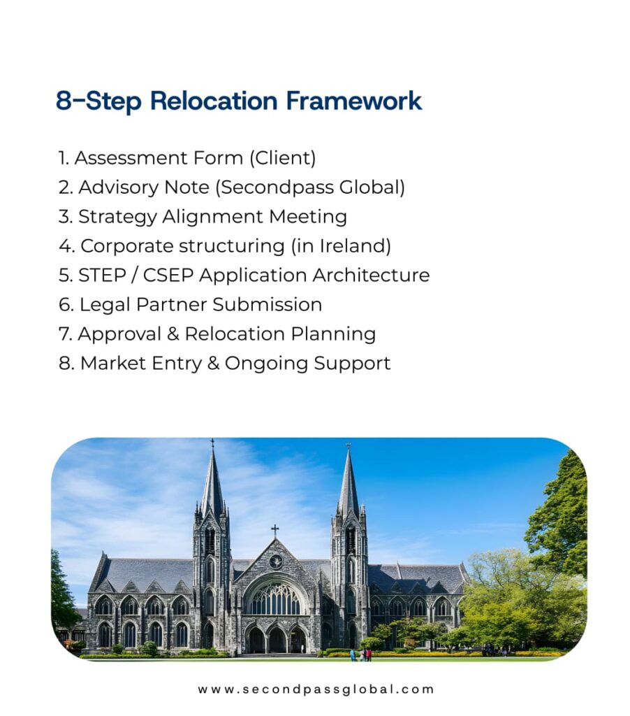 At Secondpass Global, we simplify the journey with our proven 8-step relocation framework, from initial assessment and strategic advisory to corporate structuring, visa architecture, legal submission, and long-term market support. Every step is designed to ensure a smooth transition, fast approvals, and sustainable growth in Ireland’s thriving tech ecosystem.