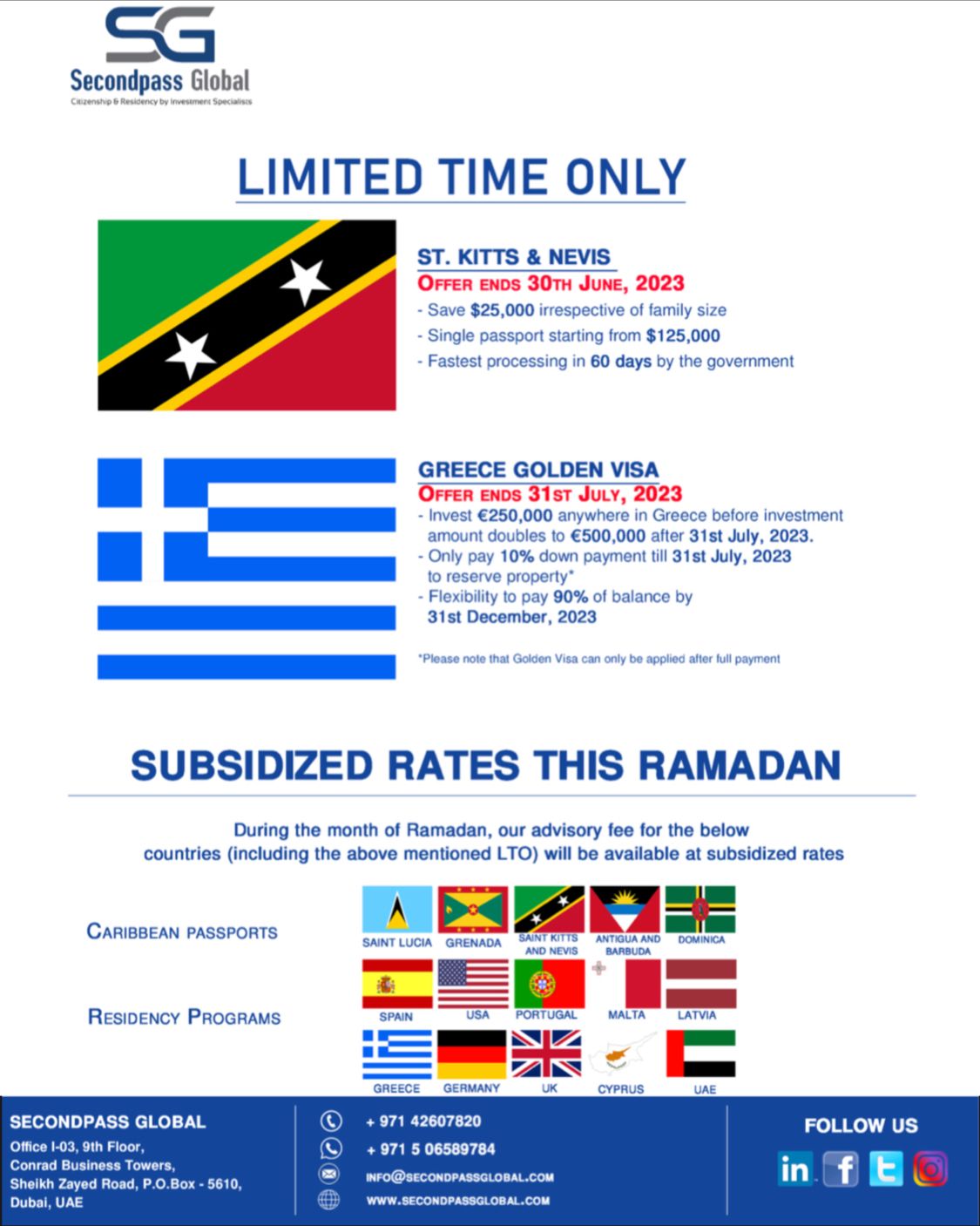 Secondpass Global, with its head office in Dubai, UAE, and it’s partner offices in over 20 countries is one of the industry leaders offering second citizenship, and residency by investment programs. The vision of the company dictates global outreach to our esteemed high net worth clients such as yourself to bring you the best Limited Time Investment Offers as they arise. Contact us TODAY to know more: