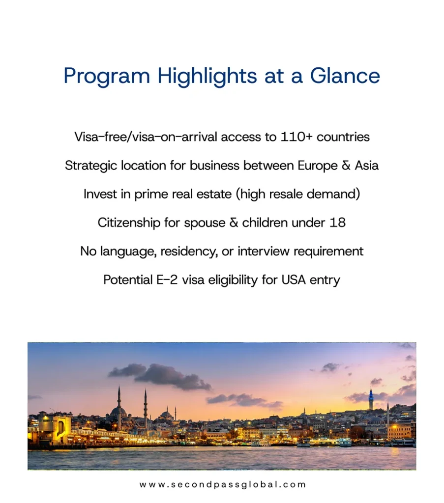 Turkey offers the perfect bridge between Europe and Asia, secure citizenship through a $400,000 real estate investment and receive your passport in just 4–6 months. Benefit from access to 110+ countries, business-friendly positioning, and eligibility for the U.S. E-2 visa. No language tests, interviews, or residency required, just a smart investment for your family’s future.