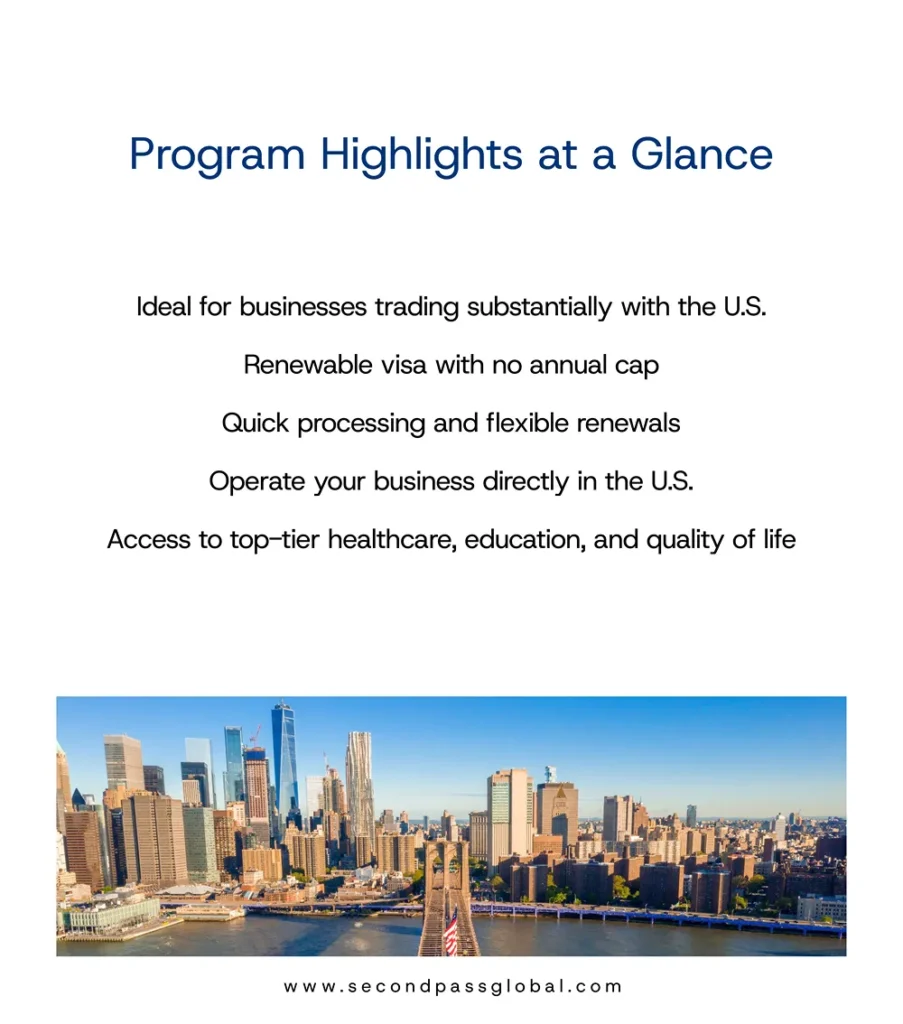 The E-1 Treaty Trader Visa offers a powerful route for investors involved in substantial trade with the United States. With processing in as little as 2–4 months, no annual cap, and flexible renewals, it’s designed for business owners ready to operate directly in the U.S. Enjoy access to world-class healthcare, education, and a higher standard of living while building your future.