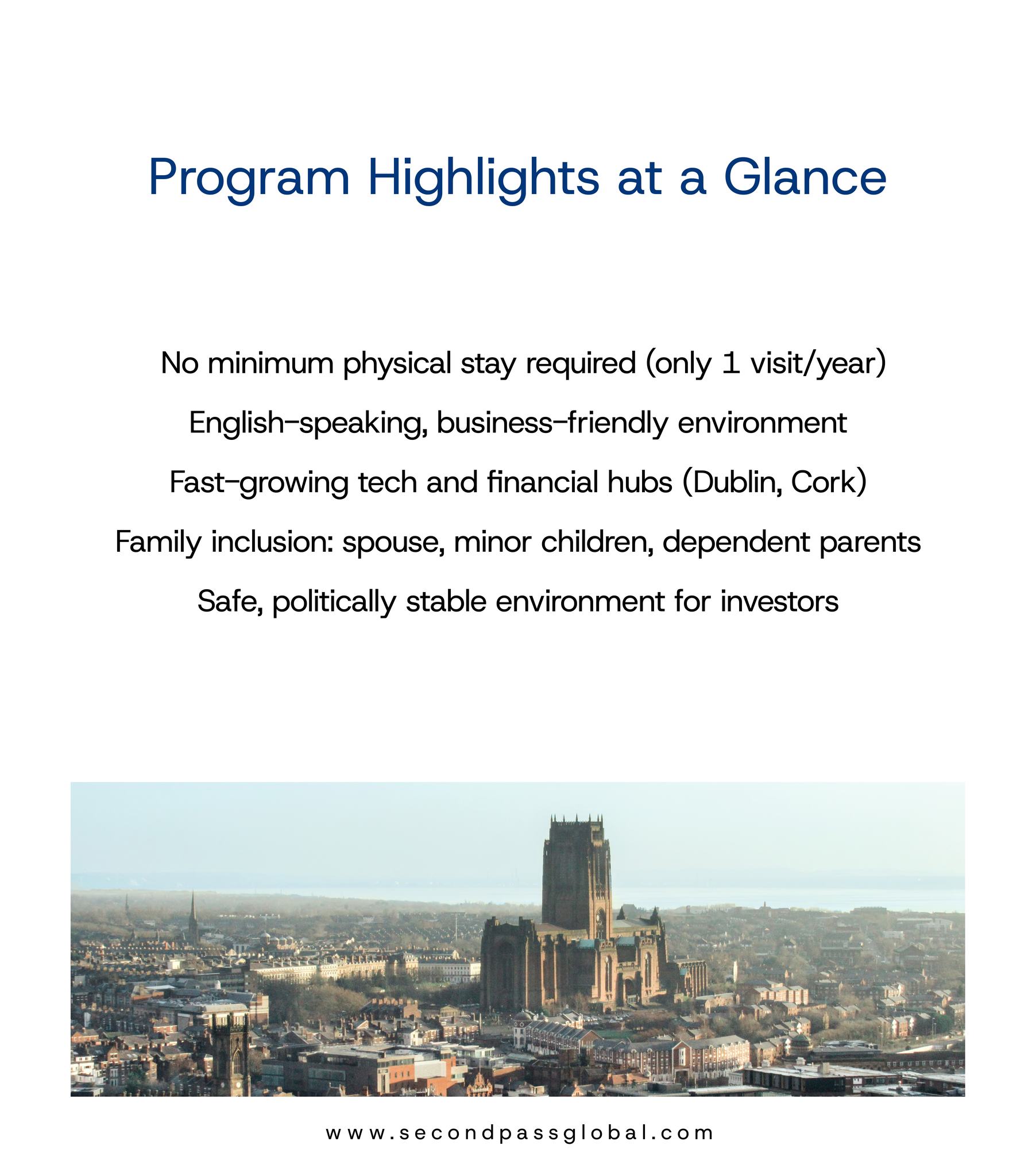 Ireland offers a smooth path to residency starting from just €50,000. With a quick 4-month processing time, no mandatory stay (only one visit a year), and access to top-tier cities like Dublin and Cork, this is where opportunity meets lifestyle. Ideal for families, the program covers your spouse, children, and dependent parents, all within a safe, stable, and English-speaking environment.