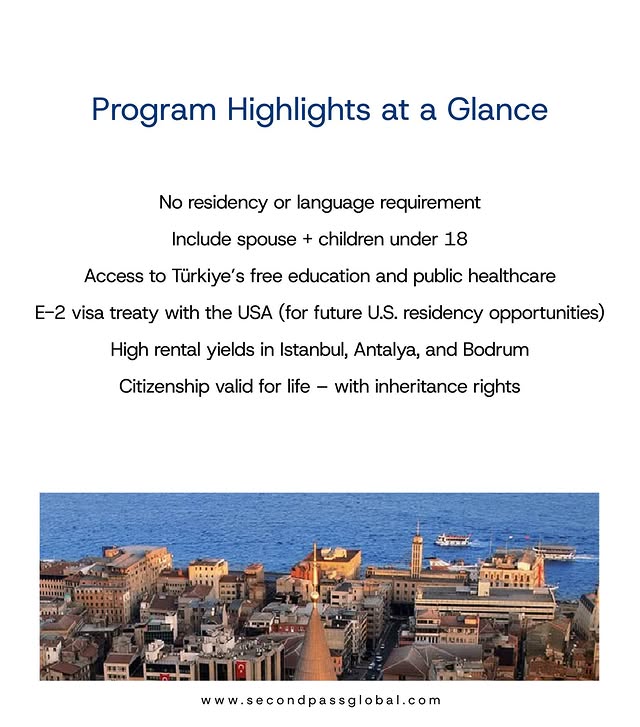 Turkey offers a fast-track route with real estate investments starting from $400,000 and citizenship granted in just 4 months. No language tests, no residency required, plus your spouse and children under 18 are included. Enjoy lifelong benefits like access to Türkiye’s free education, public healthcare, and the E-2 visa treaty with the U.S. With high rental yields in hotspots like Istanbul, Antalya, and Bodrum, it’s more than a passport, it’s a future-proof investment.